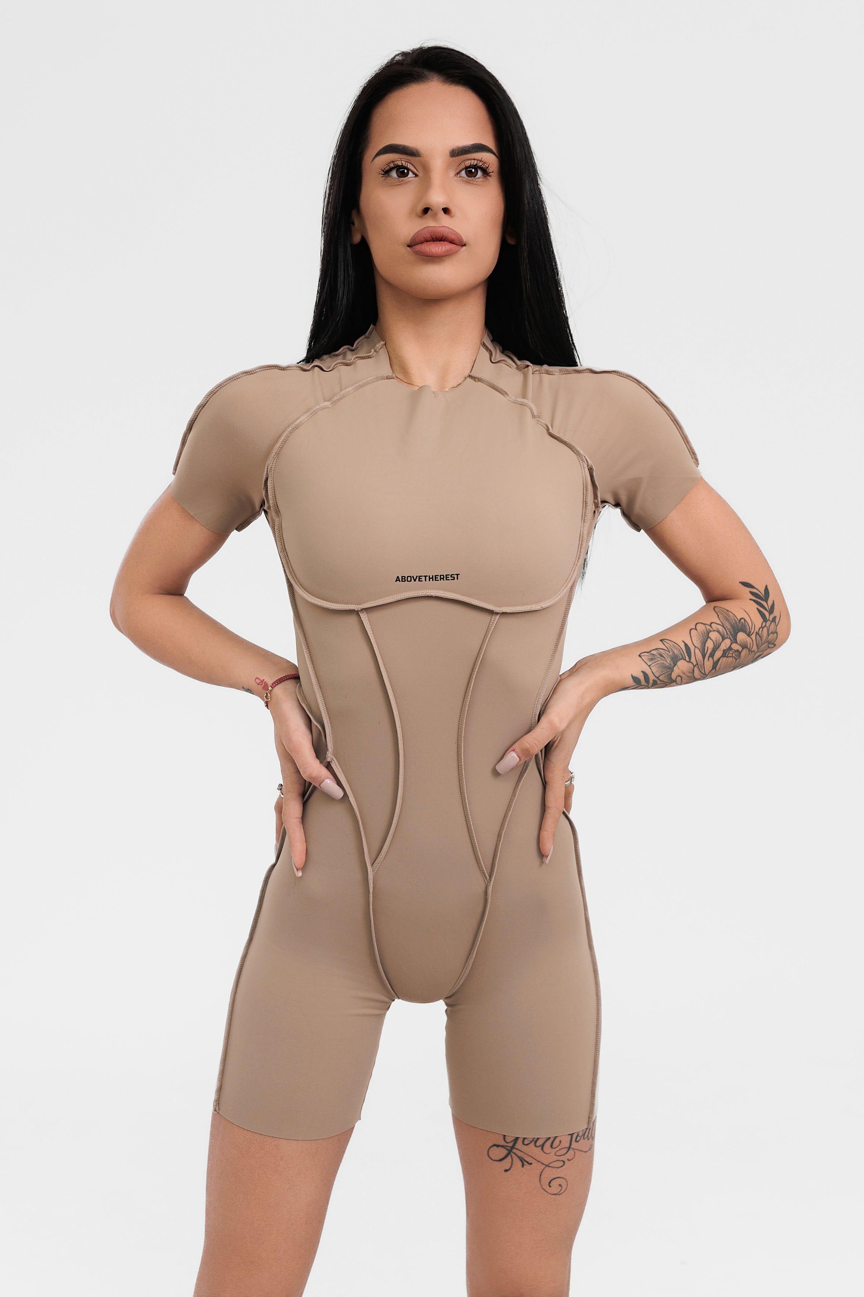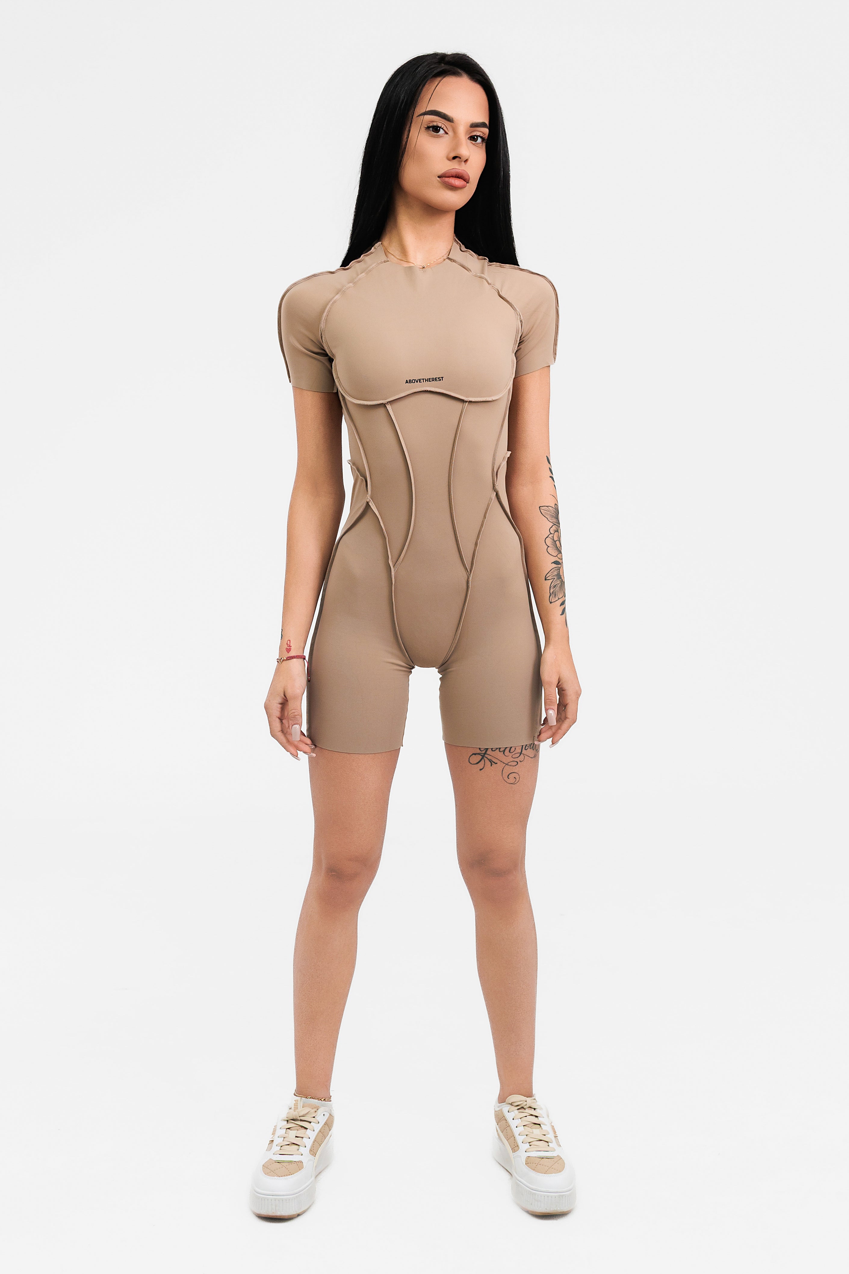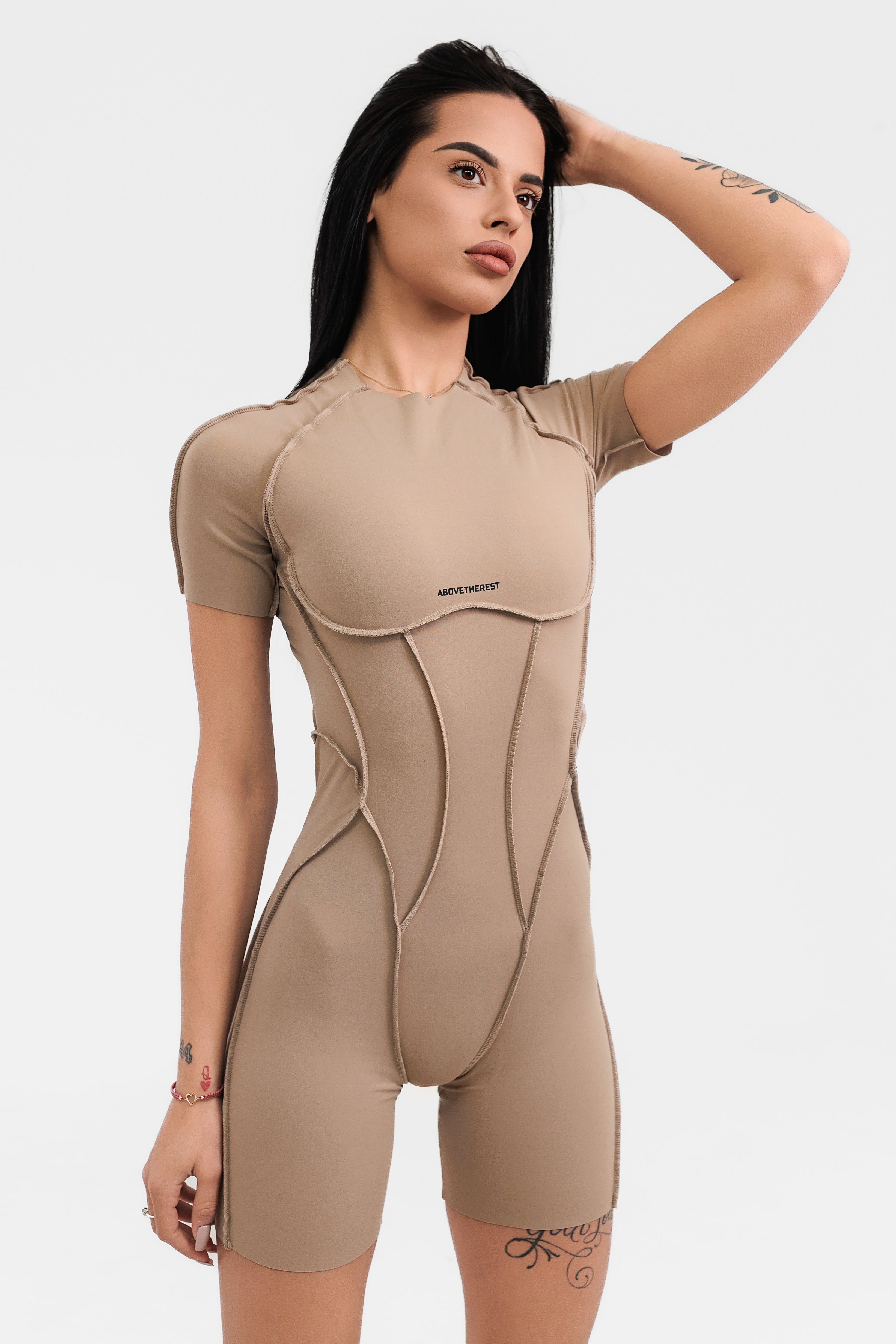 Къс гащеризон INFINITY e едно от най-новите предложения от Above The Rest. Изработен е от еластична материя с премиум качество, която ще Ви впечатли със своята гладкост и мекота при допир. Дизайнът е атрактивен и различен, с обърнати шевове и гол гръб, а кройката подчертава и оформя фигурата. Не възпрепятства движенията и осигурява максимална свобода за действие по време на спортни занимания от всеки тип.